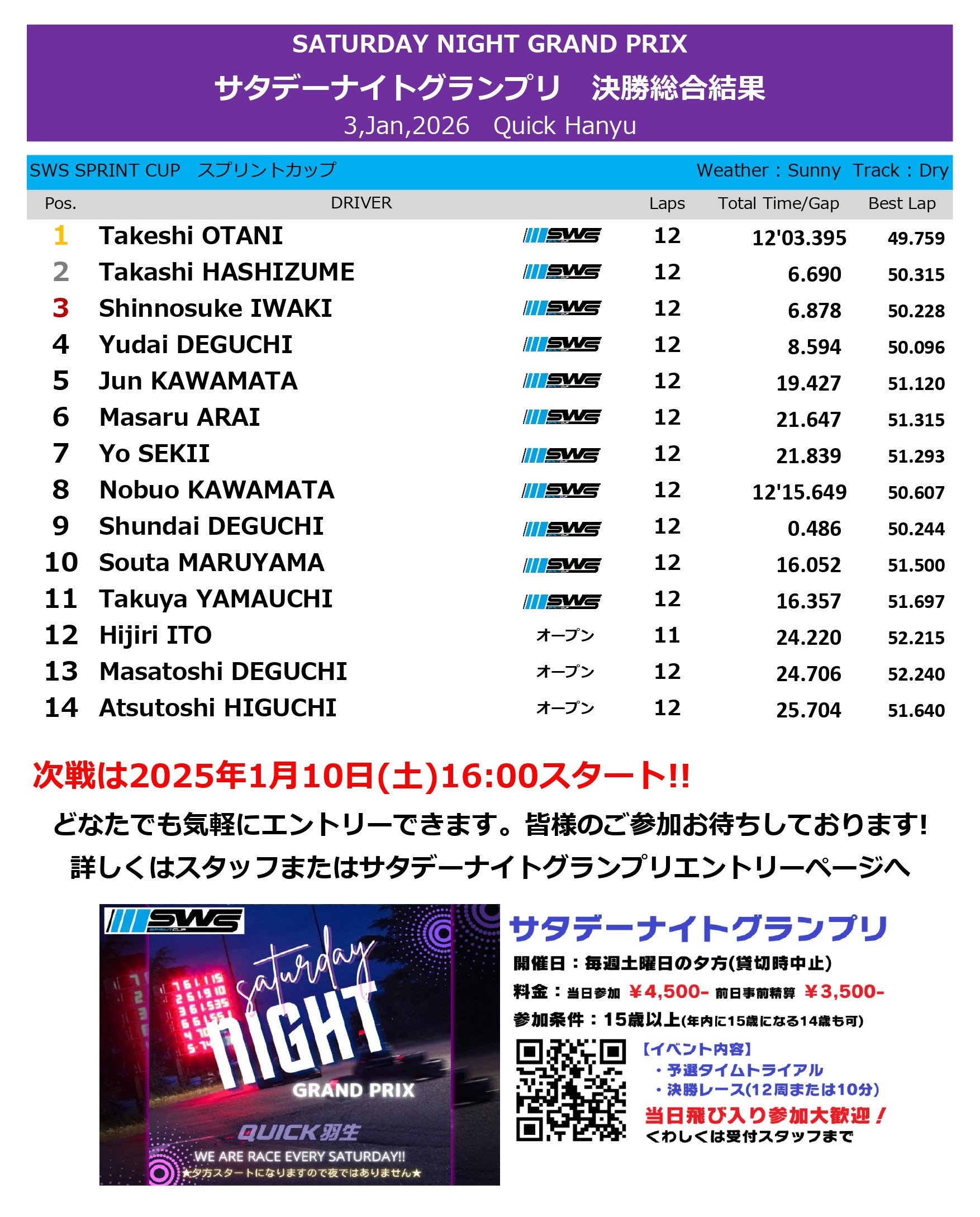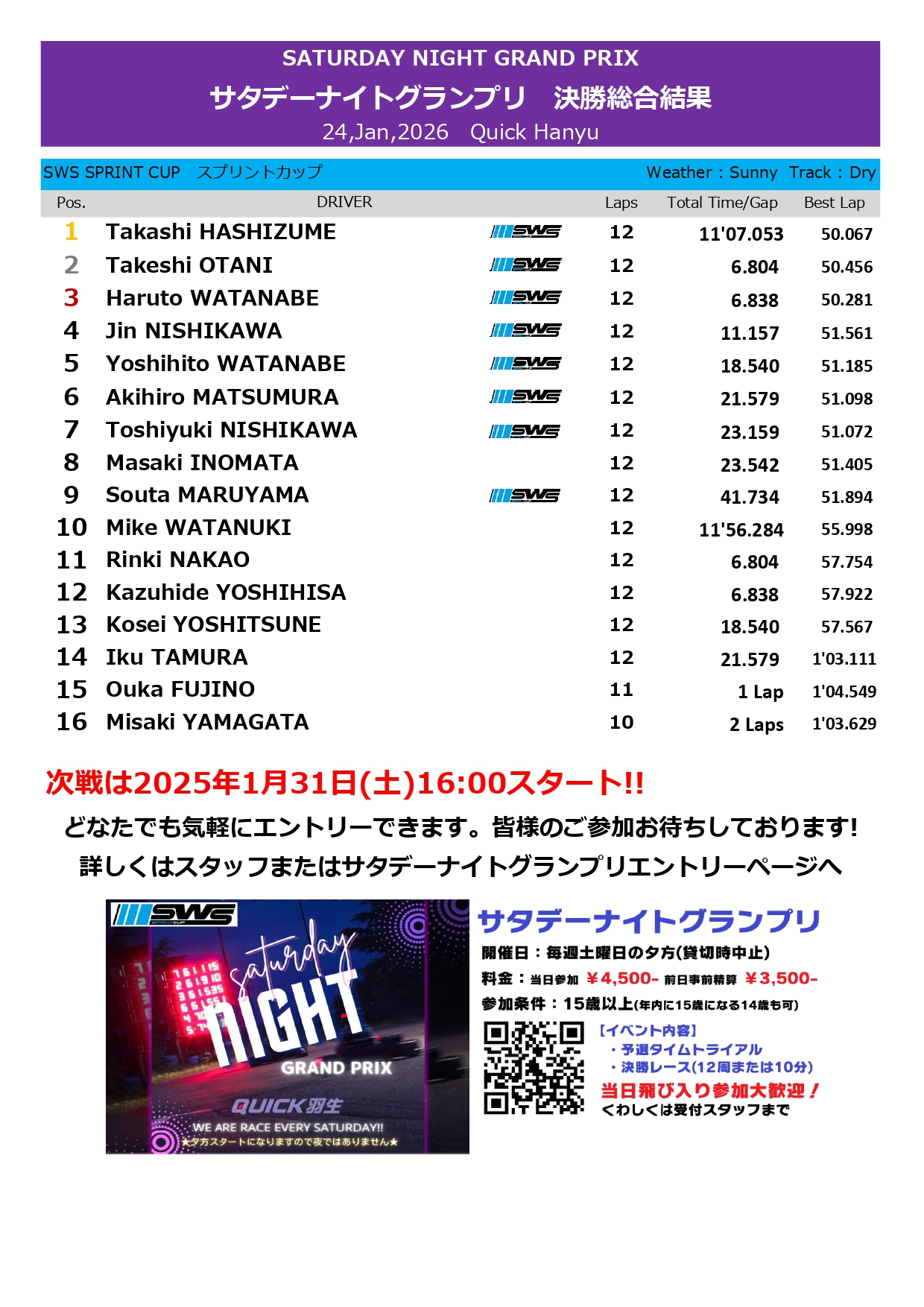 ・ 1月11日 第36回サタデーナイトグランプリ 優勝:Yuuki NUNODA