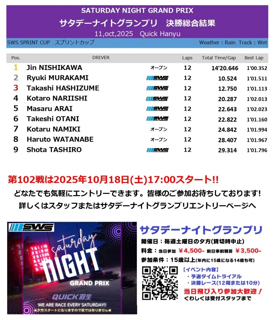 10月11日(土)に『サタデーナイトグランプリ第101戦』を開催しました。