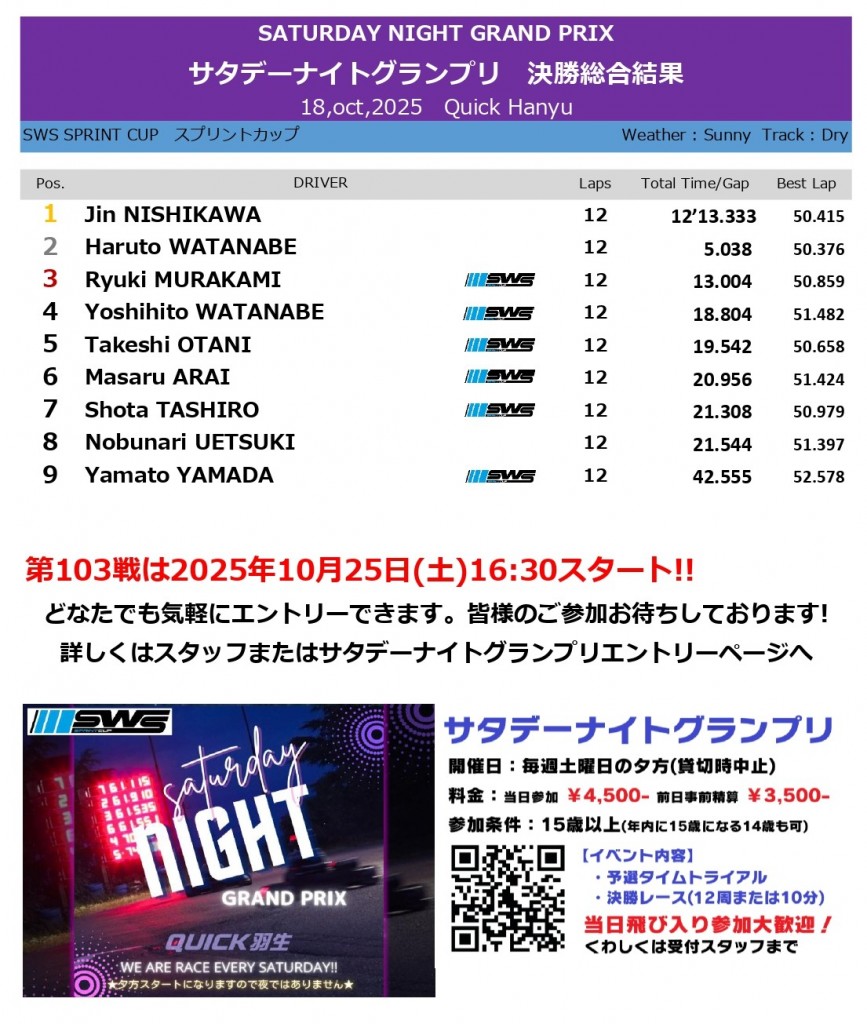 10月18日(土)に『サタデーナイトグランプリ第102戦』を開催しました。