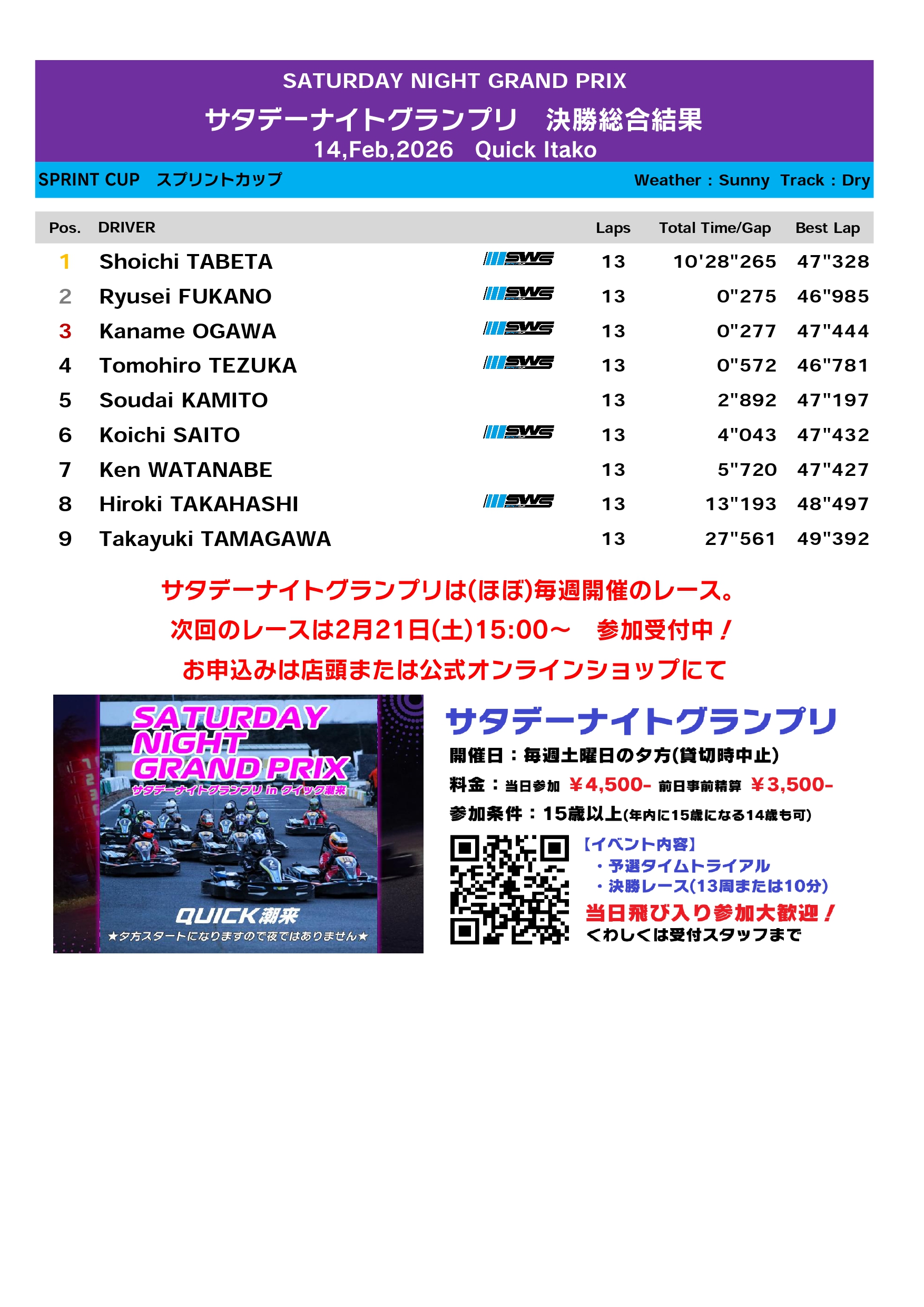 ・ 3月 1日 第43回サタデーナイトグランプリ 優勝:Takanari SATO